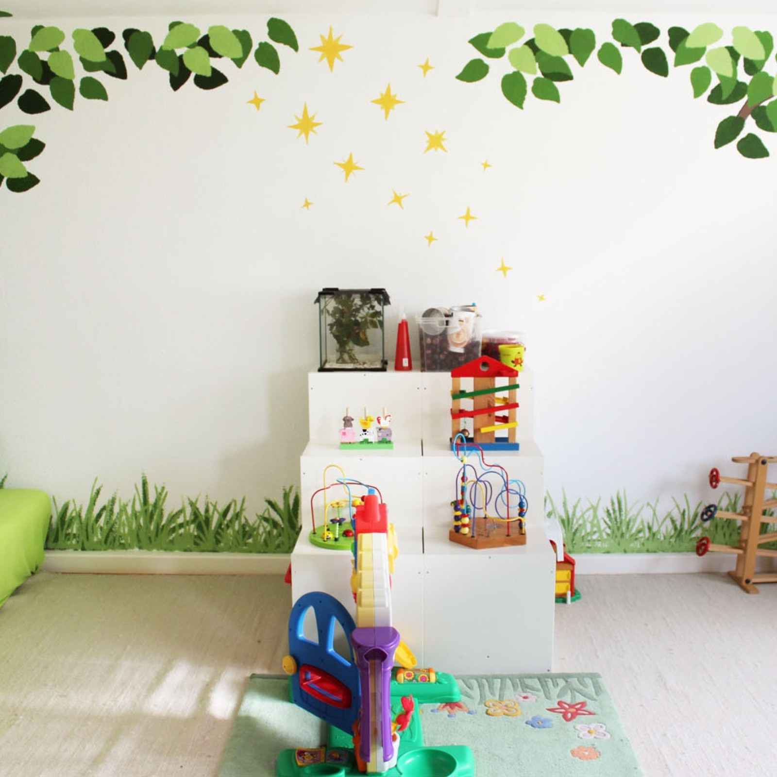 Ein großes Spielzimmer mit verschiedenen Möglichkeiten, wie z. Bsp.: Puppenecke, Bauecke, Kreativecke, Kuschelecke mit vielen Büchern usw.